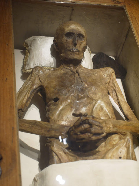 Mumifiziert ist er, keine Frage und keine Sau weiß warum dies so ist. Er ist weder einbalsamiert, noch sonst irgendwie nach seinem Tode haltbar gemacht worden, er ist einfach in seinem Eichensarg nicht verrottet.