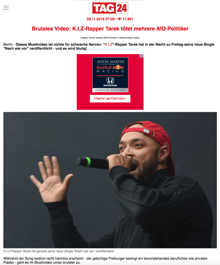 Er wird einen Musikpreis bekommen und es ist abzuwarten ob nicht auch wie bei „Feine Sahne..“ der Herr Bundespräsident und natürlich auch AKK, diesen Dreck unterstützen. Abgesehen davon, dass alle sog.“Texte“ oder besser Hassparolen solcher ‚Kuenstler“ einmal genauer betrachtet werden sollten. Die Spitzen der Gesellschaft finden aber auch „Rammstein“ künstlerisch wertvoll und die Jugend schreit deren Parolen ebenfalls nach. „Ein bisschen Friede“ reicht heute nicht mehr für Weltruhm.