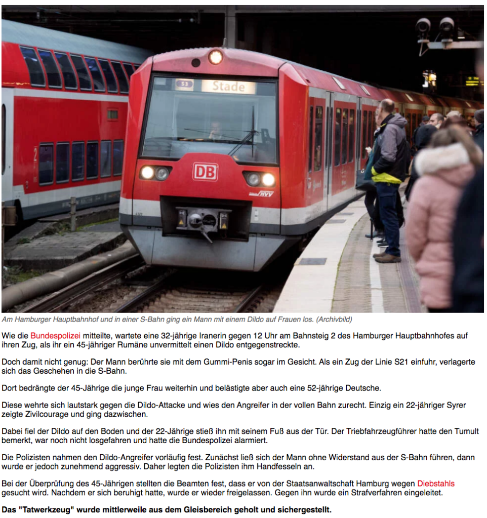 Der Dildo-Angreifer von Hamburg, faszinierend was es so alles gibt. Ich möchte wetten, viele Eingeborene haben so ein Ding noch nicht einmal in der Hand, geschweige denn im Gesicht gehabt.