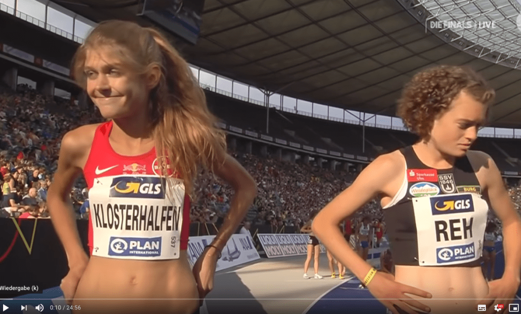 Gezeigt wird das Bild einer international erfolgreichen deutschen Läuferin, mit einer Größe von 174 Zentimetern und einem Gewicht von 48 Kilogramm, wahrscheinlich gewogen mit Schlüsselbund, Laufschuhen und nachdem sie vorher mindestens noch einen Liter Wasser getrunken hatte. Aber nehmen wir an, die Angabe stimmt, dann sind wir bei einem Body mass Index von 15,9, dies entspricht einem erheblichen Untergewicht. Physiologischer erwarten wir bei der Körpergröße mindestens 58 Kilogramm.