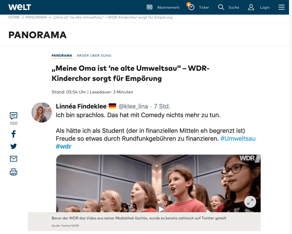Das Elaborat selbst – im negativen Sinn gemeint – dargeboten von Kindern ist allerdings inzwischen von der Website des WDR sang- und klanglos verschwunden, aber das Internet vergisst zum Glück nichts.