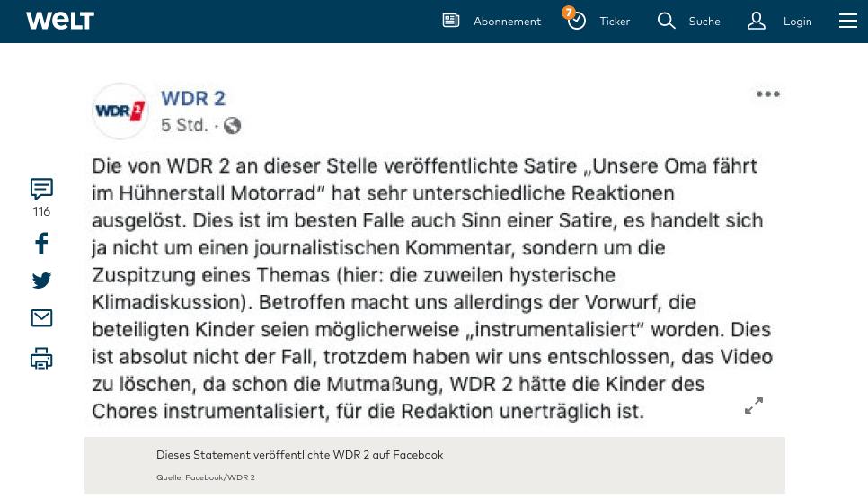Mir bleiben hier die Worte im Hals stecken, wie anders als Instrumentalisierung könnte das bezeichnet werden? Und, der Gipfel der Chuzpe: der WDR ist das Opfer, das Opfer der dummen Menschen, die die „Satire“ nicht verstehen.